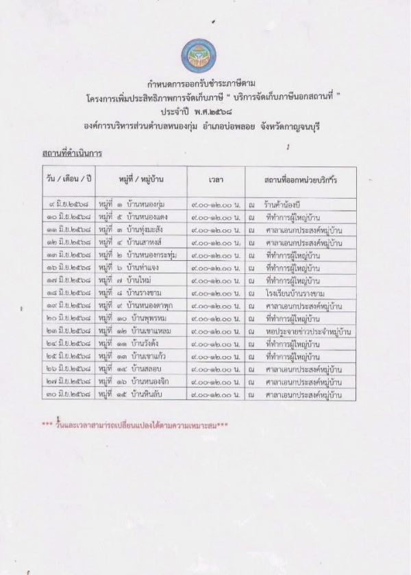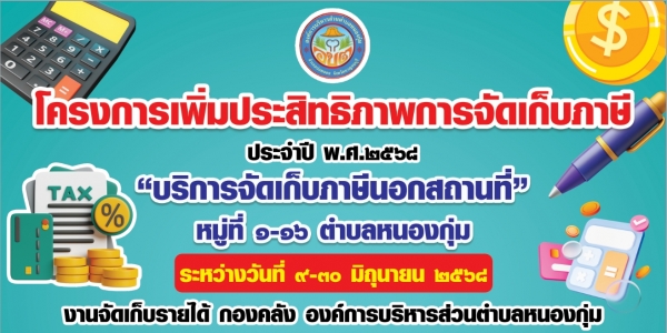 ประชาสัมพันธ์... โครงการเพิ่มประสิทธิภาพการจัดเก็บภาษี ประจำปี พ.ศ.2568 " บริการจัดเก็บภาษีนอกสถานที่" หมู่ที่ 1 - 16 ตำบลหนองกุ่ม
